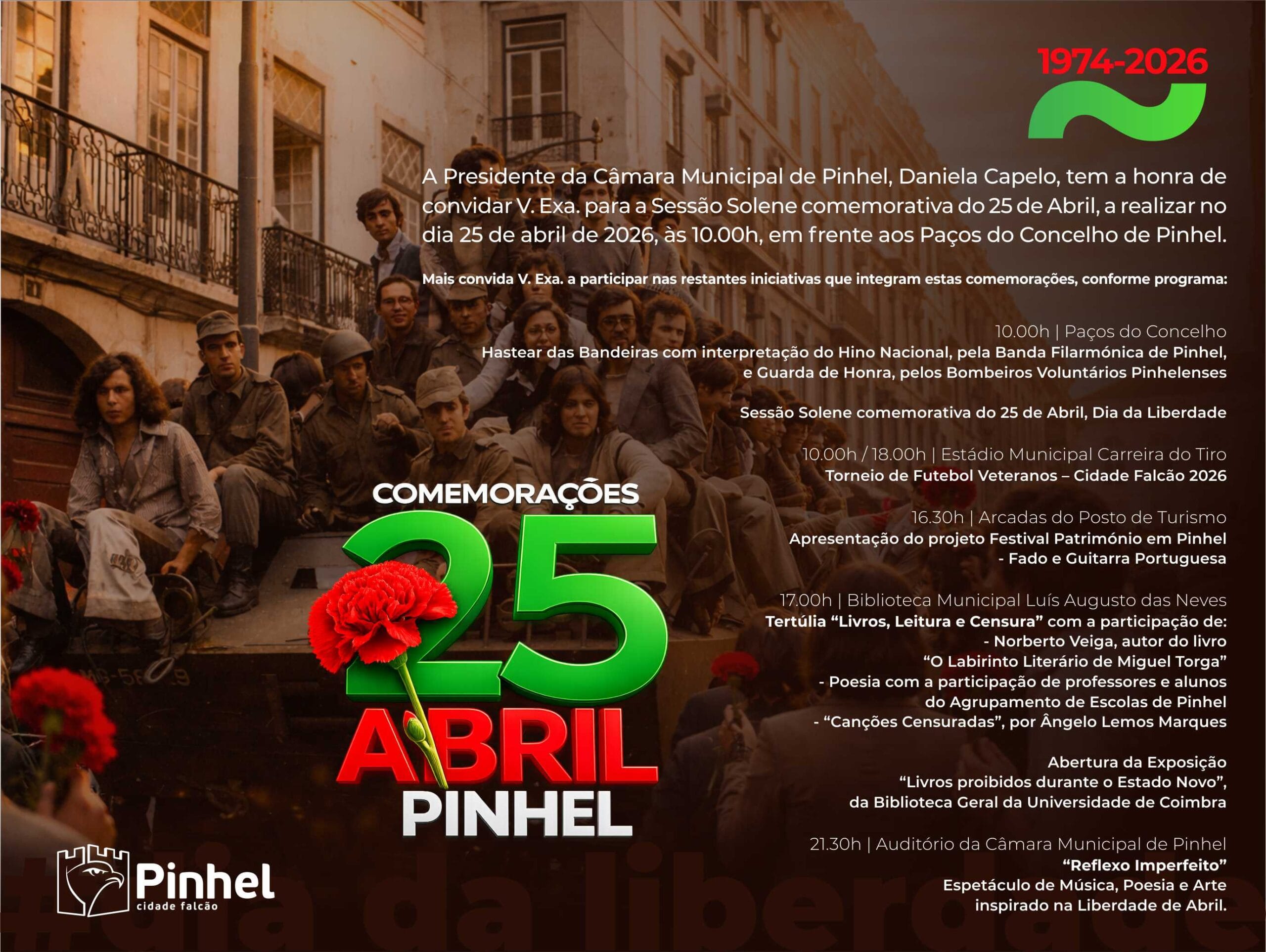 O Município de Pinhel celebra, no próximo dia 25 de Abril, o 52.º aniversário da Revolução dos Cravos. Sob o lema da Liberdade, a autarquia preparou um conjunto de iniciativas que abrangem momentos solenes, eventos desportivos e atividades culturais de reflexão histórica.